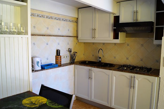Small and practical kitchen open to the living room fully equipped with cutlery and crockery, kitchen to gas, electric oven, small fridge with freezer, microwave, coffee maker Melitta, kettle and toaster.